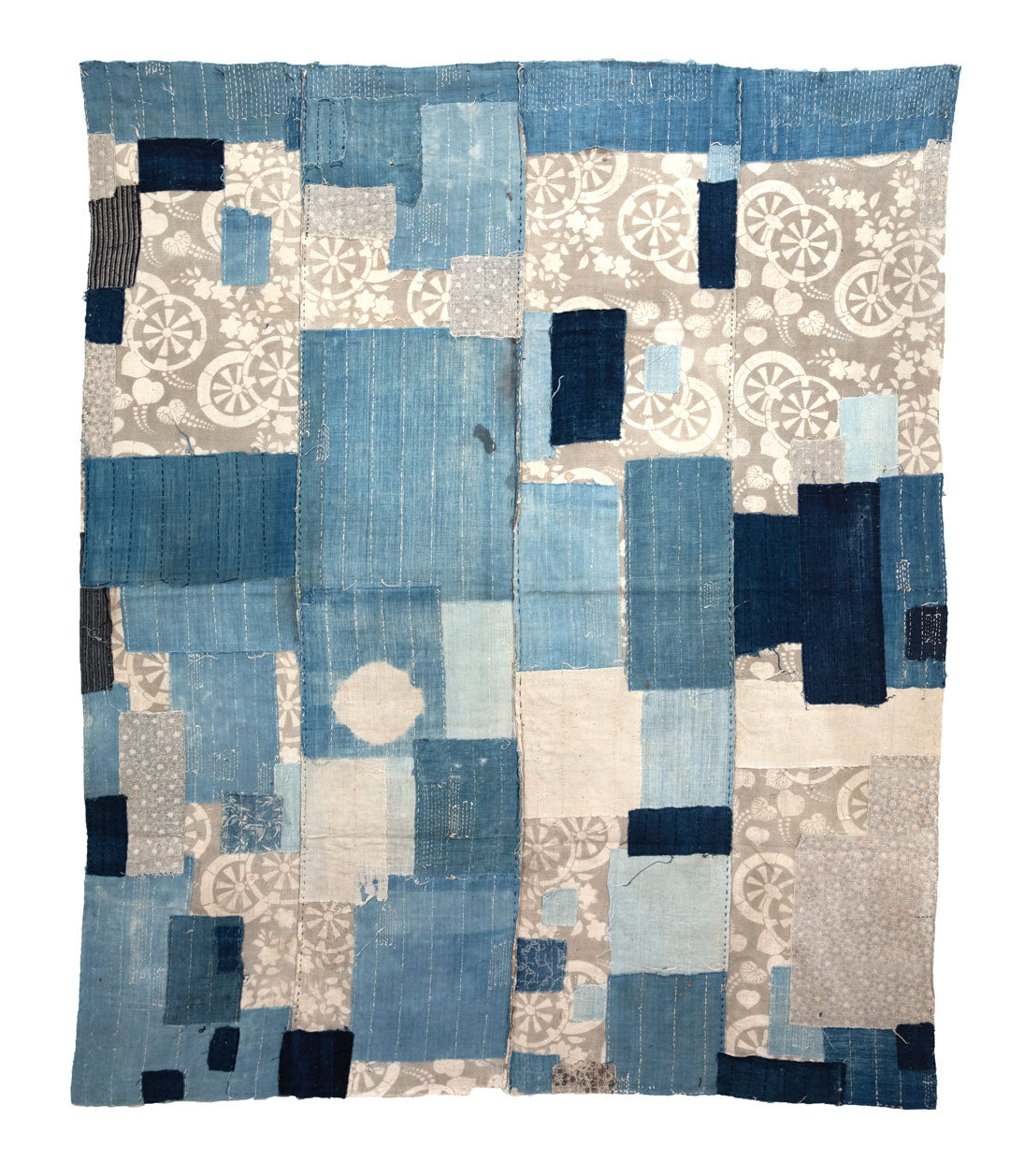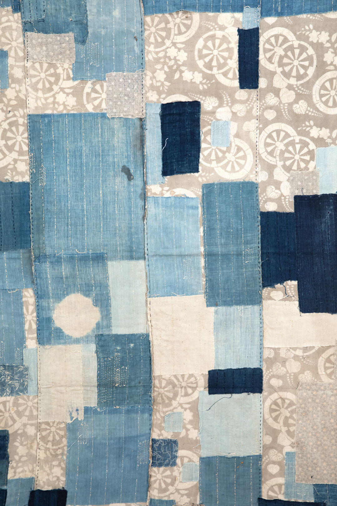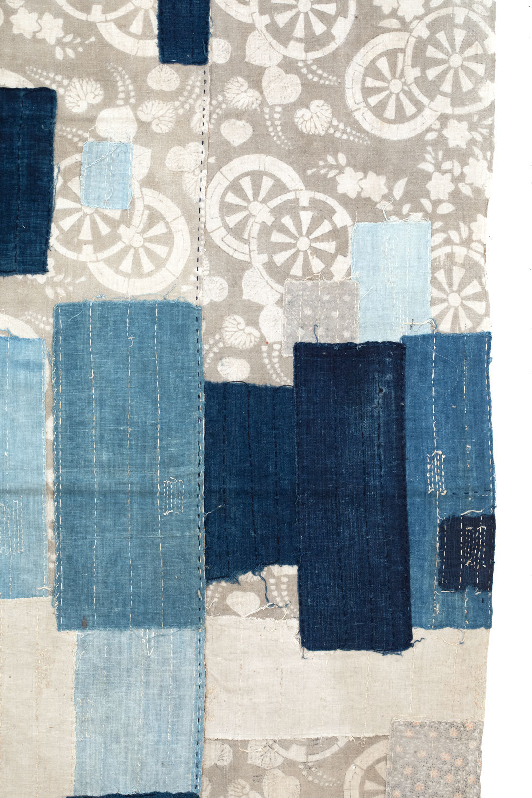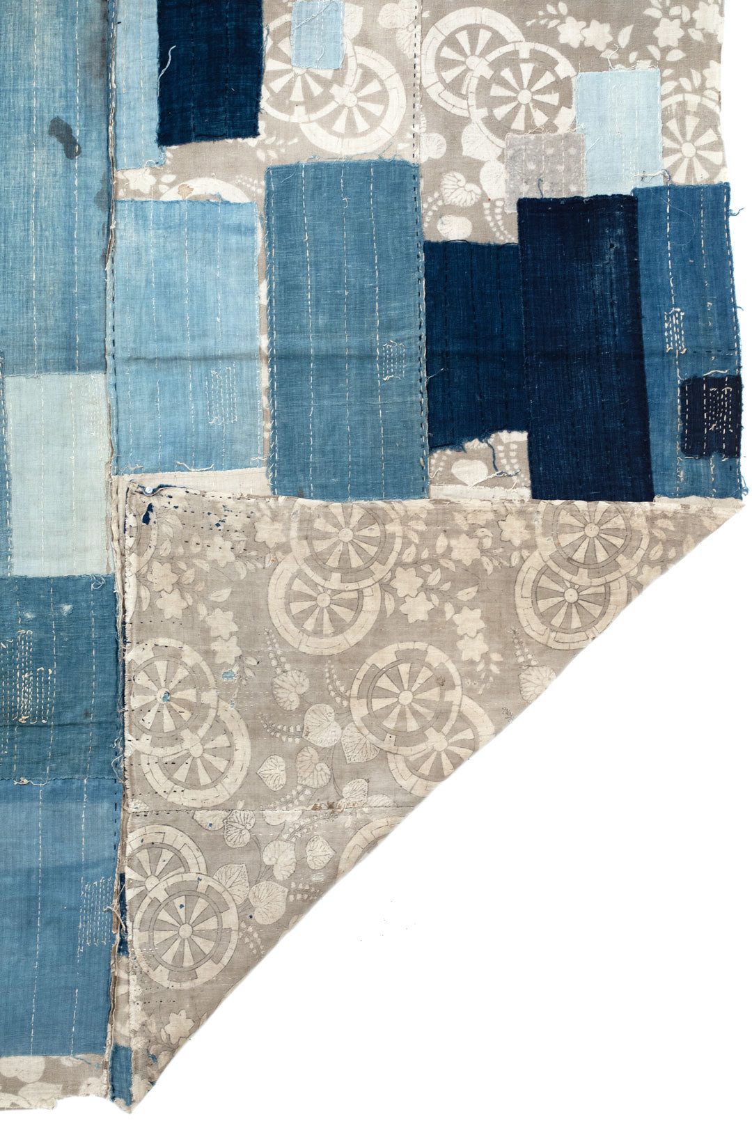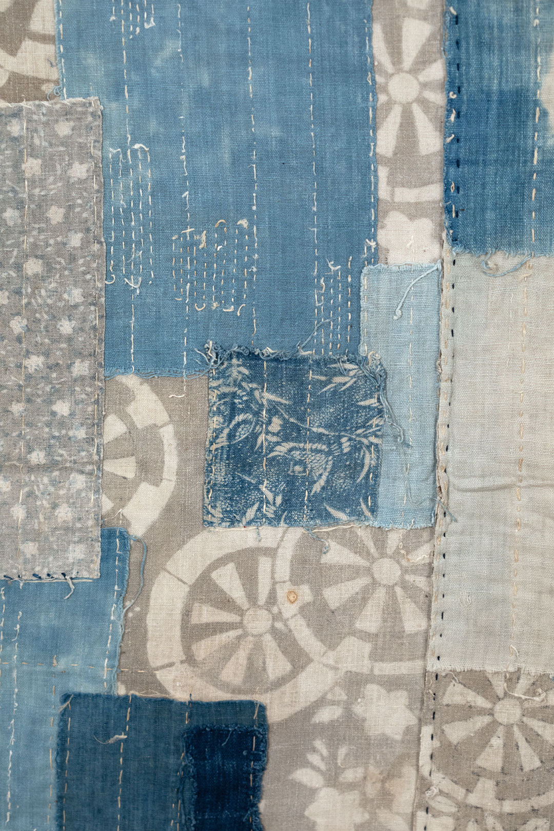 The base of this Boro is an unusual grey katazome cotton with indigo patches. Katazome is a batik-like method of painting using a paste, then dying the piece, revealing the design once the paste is washed away. They are secured with cotton stitching for durability.