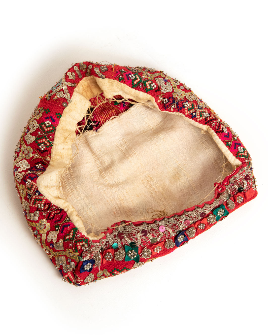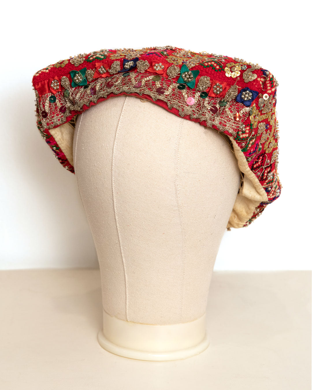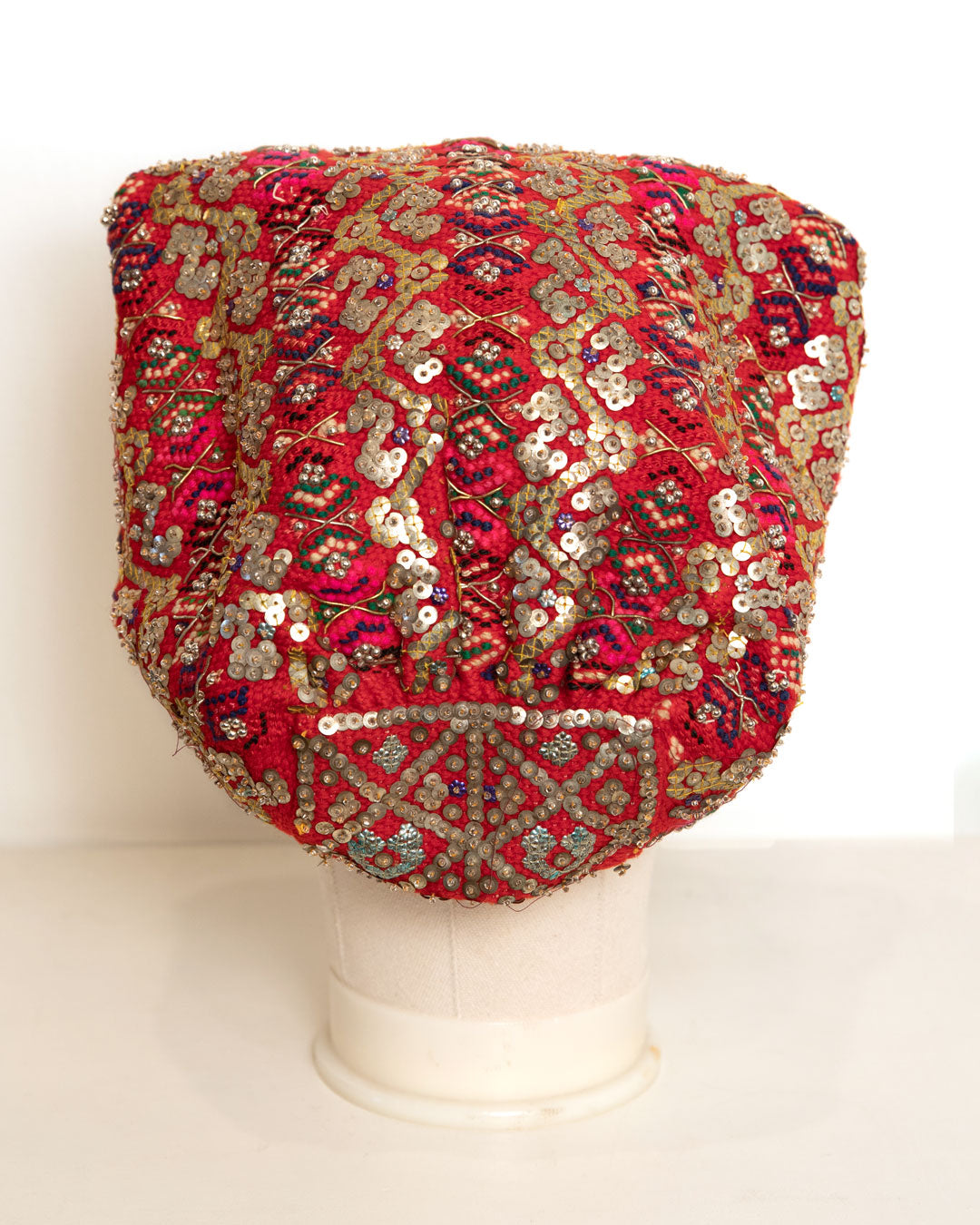 The ground is a textured cotton adorned with sequins, silk appliqué, & wool embroidery. The front of the dress is left blank since it is covered with a decorative apron, and two openings sit on either side of the waist to allow this to be hidden when tied. Panels of silk embroidered lace sit between the rows of dense sequins and line the sleeves and bottom of the dress. The red wool hat is woven with polychromatic wool thread designs, sequins, and decorations of silk ribbons and metallic trim. The waist sash is also wool woven with a black ground and polychromatic and metallic accents.