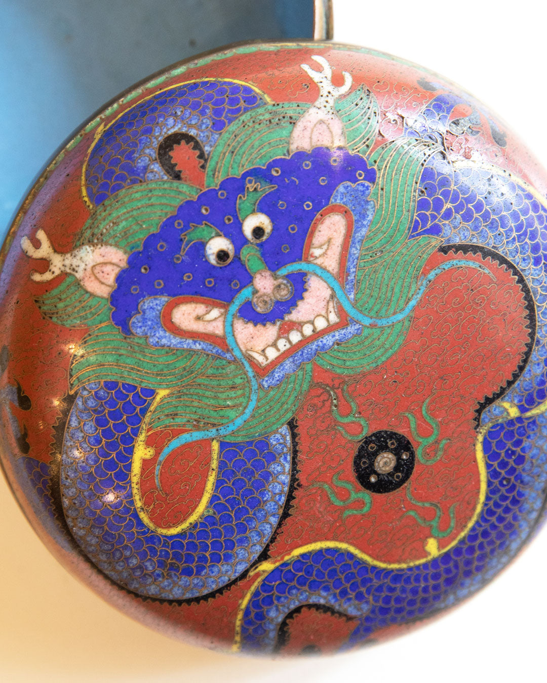 The method of cloisonné dates back to ancient times - making its way from the Middle East and North Africa, to Europe, and to East Asia. Metallic ribbons are bent and shaped to create small cells that are then soldered to the bronze base, and filled with enamel. This box is decorated with a five-clawed dragon with a central flaming pearl. The borders are lined with water and the negative space is filled with clouds.