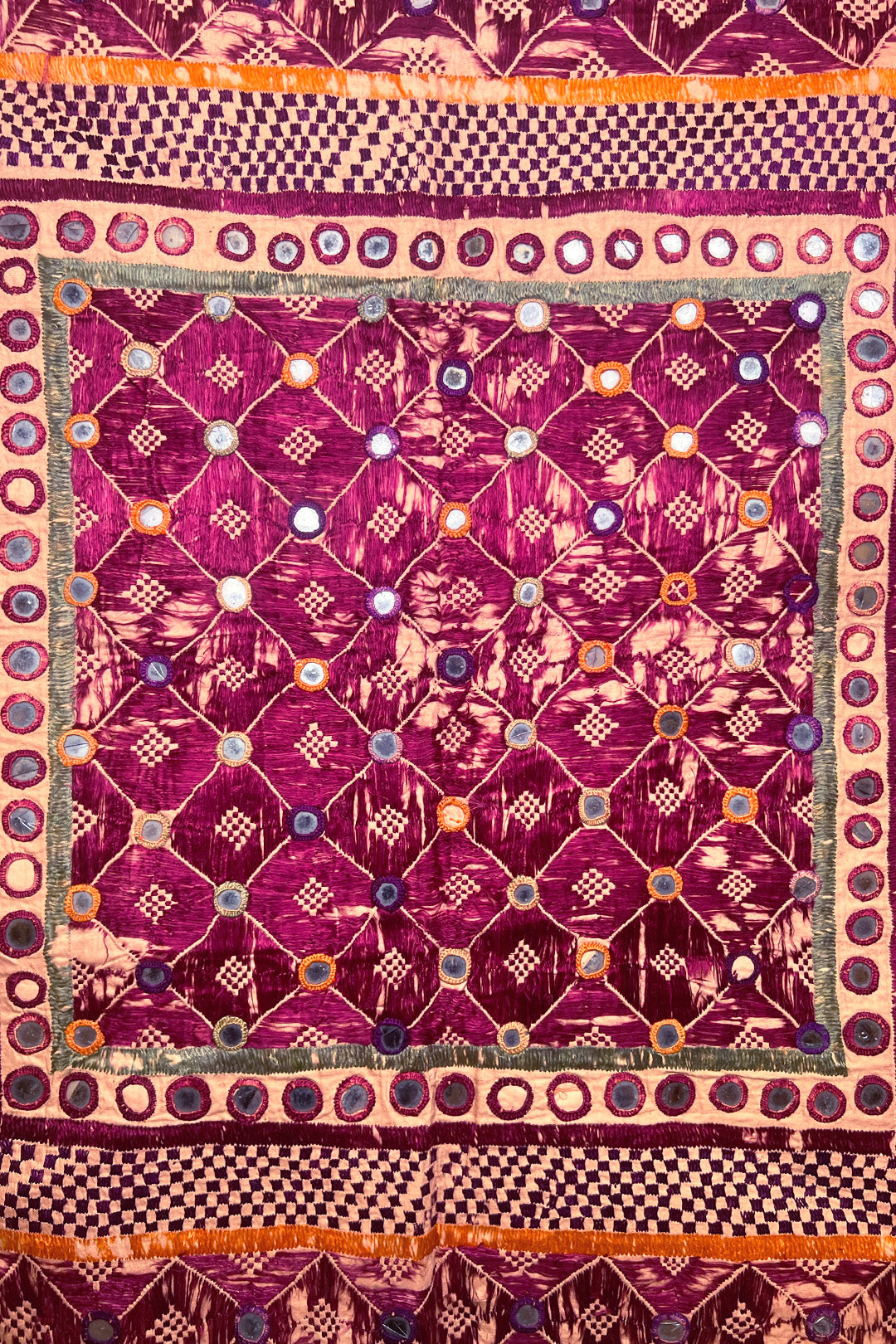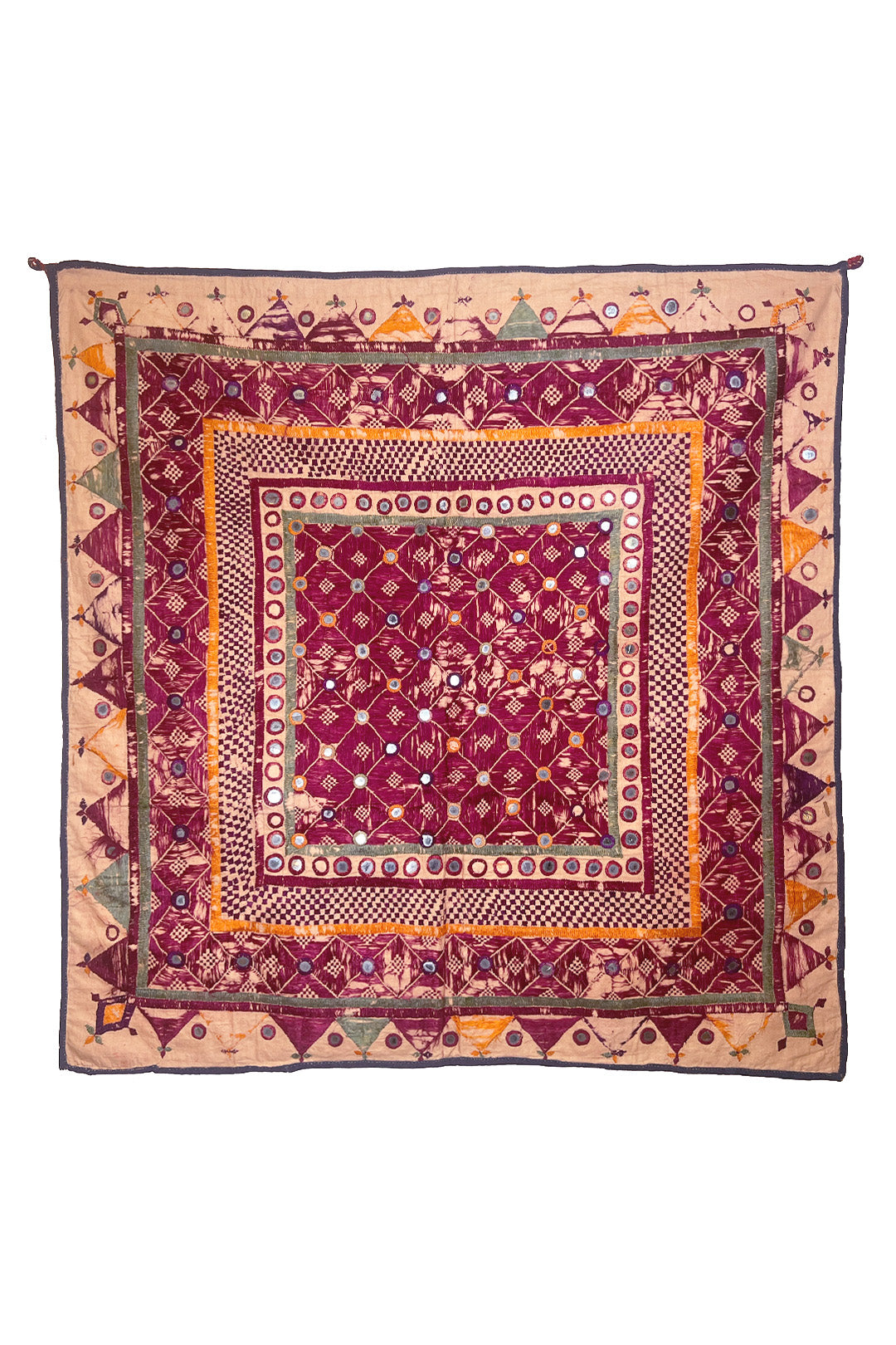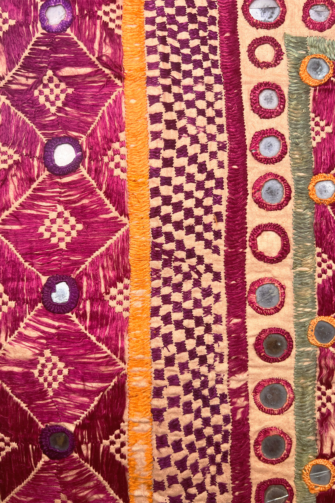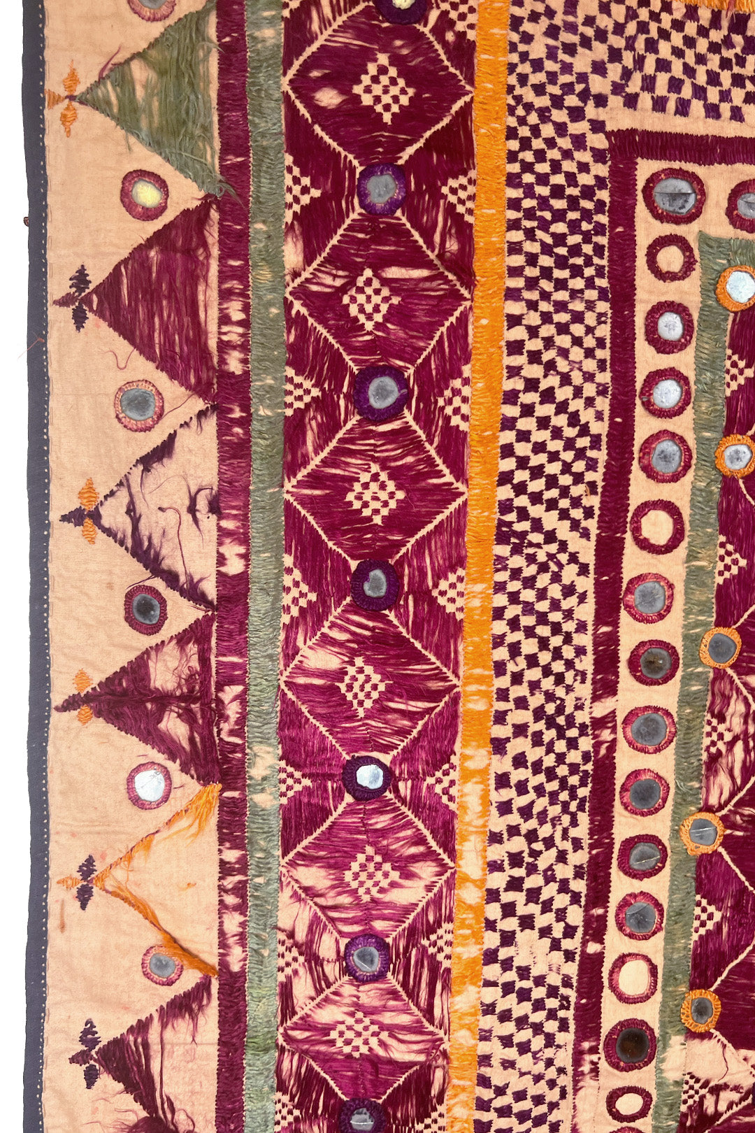 “Chalka” translates to “reflection of light,” and the mirrors on this festival hanging would have done just that. Like many textiles in rural India, they were embroidered by the women to show their creative skills and decorate their home. This piece is embroidered using polychromatic silk floss thread on a cotton ground. The maker used mostly satin stitches and Shisha embroidery to secure the mirrors.