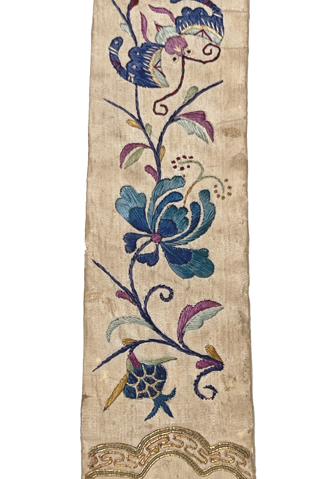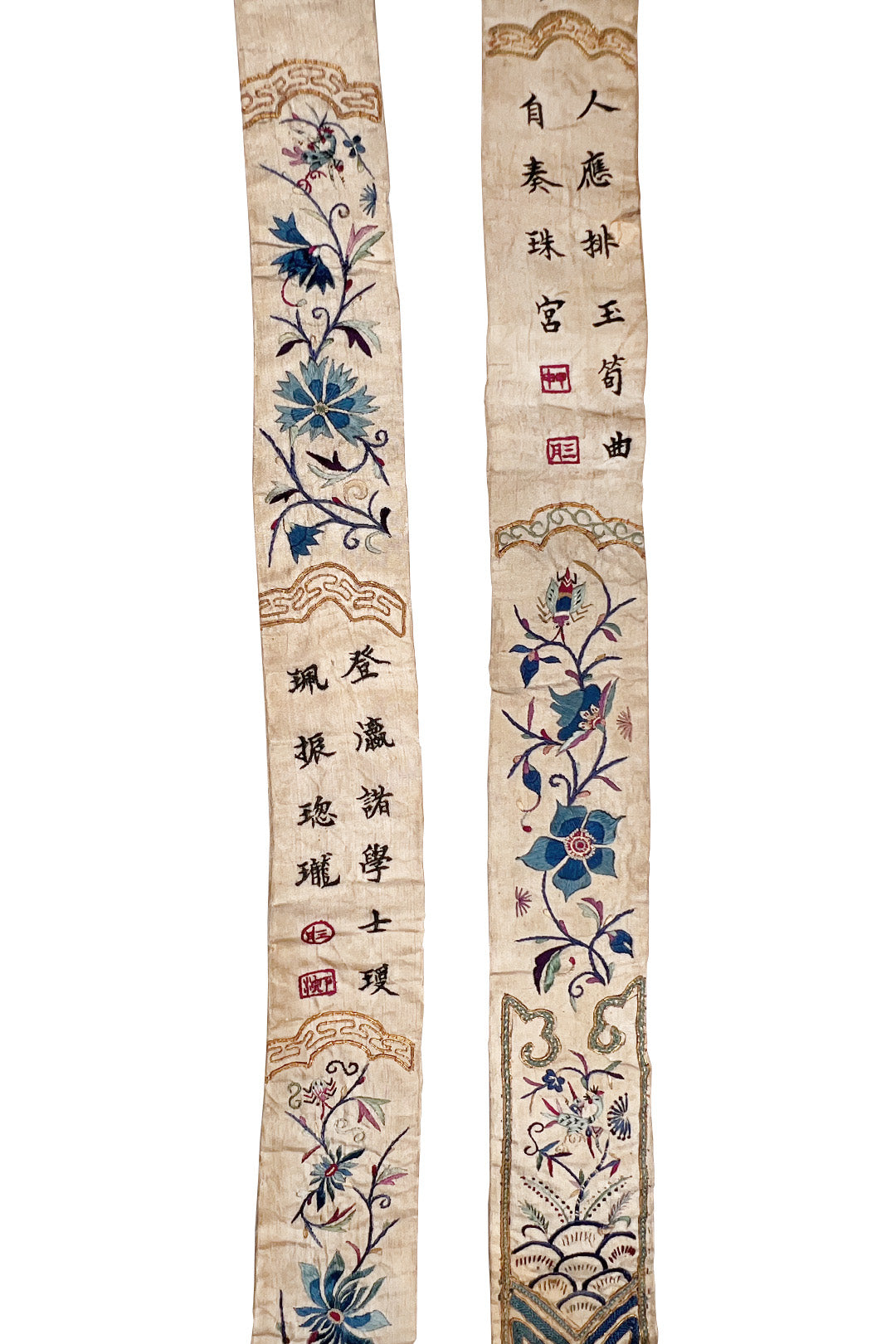 Two tie-shaped embroidered fragments, likely once hanging from a piece of clothing or wall hanging.