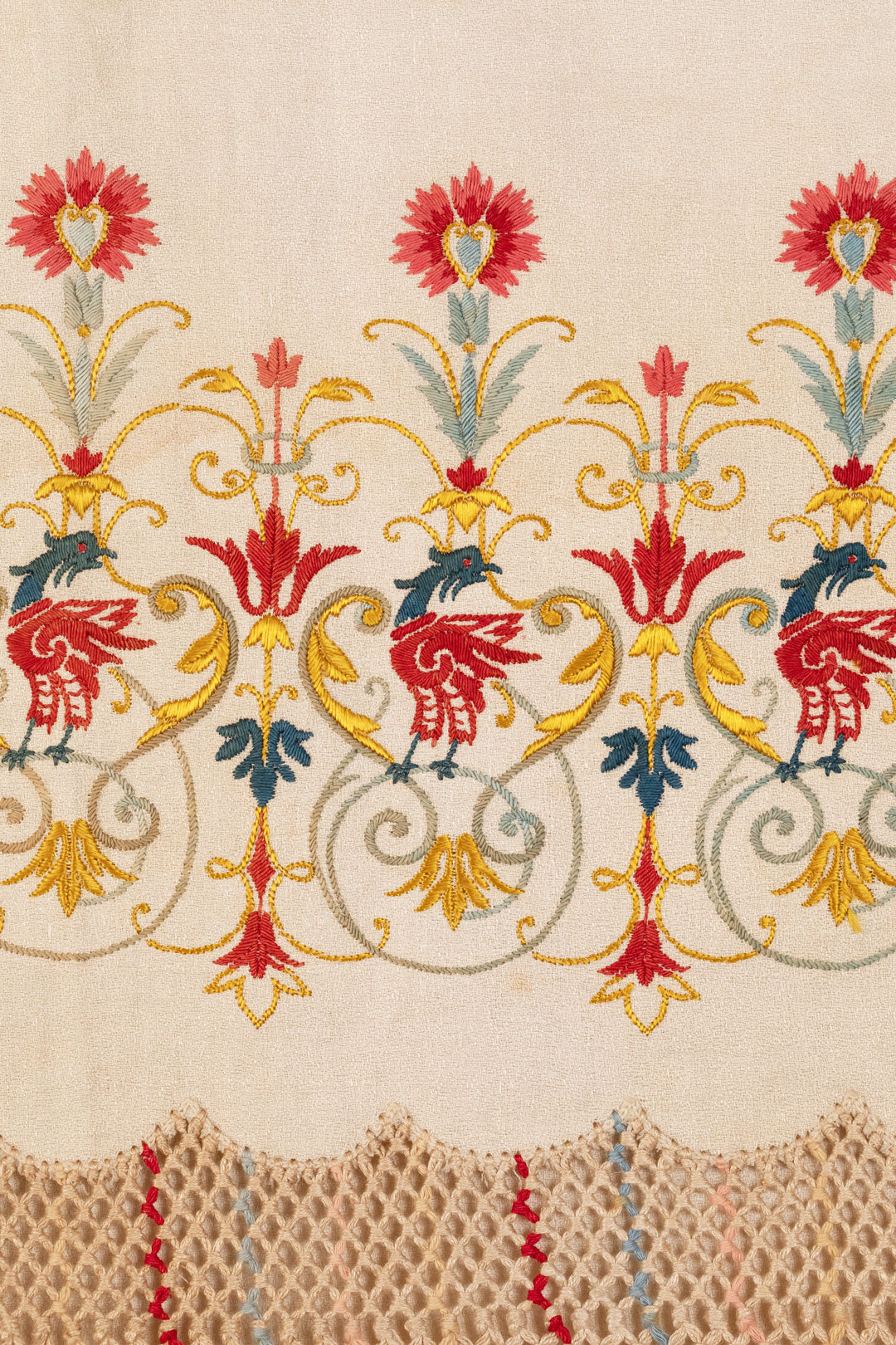 We're still researching the origins of this piece, but it is too stunning to not be shared. This piece has a soft linen ground which is hemmed in a scalloped shape on both short ends, and finished with cotton knotted fringe. There is identical embroidery on both short ends - it is mostly florals and ornamental leaves, with birds in the center of each arrangement. The polychromatic embroidery is done in mostly cotton, but the yellow gold is silk which adds dimension.