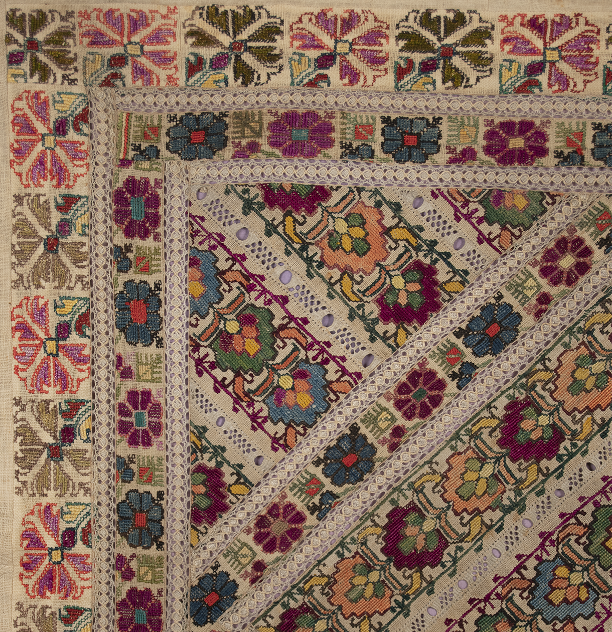 Greek Islands composite panels were created by using fragments of old embroideries to create new patterns. As Greek and ottoman embroideries often have large bare areas, those parts often deteriorated while the embroidered pieces remained intact, so the composites recycled the embroidered parts in a new imaginative way.