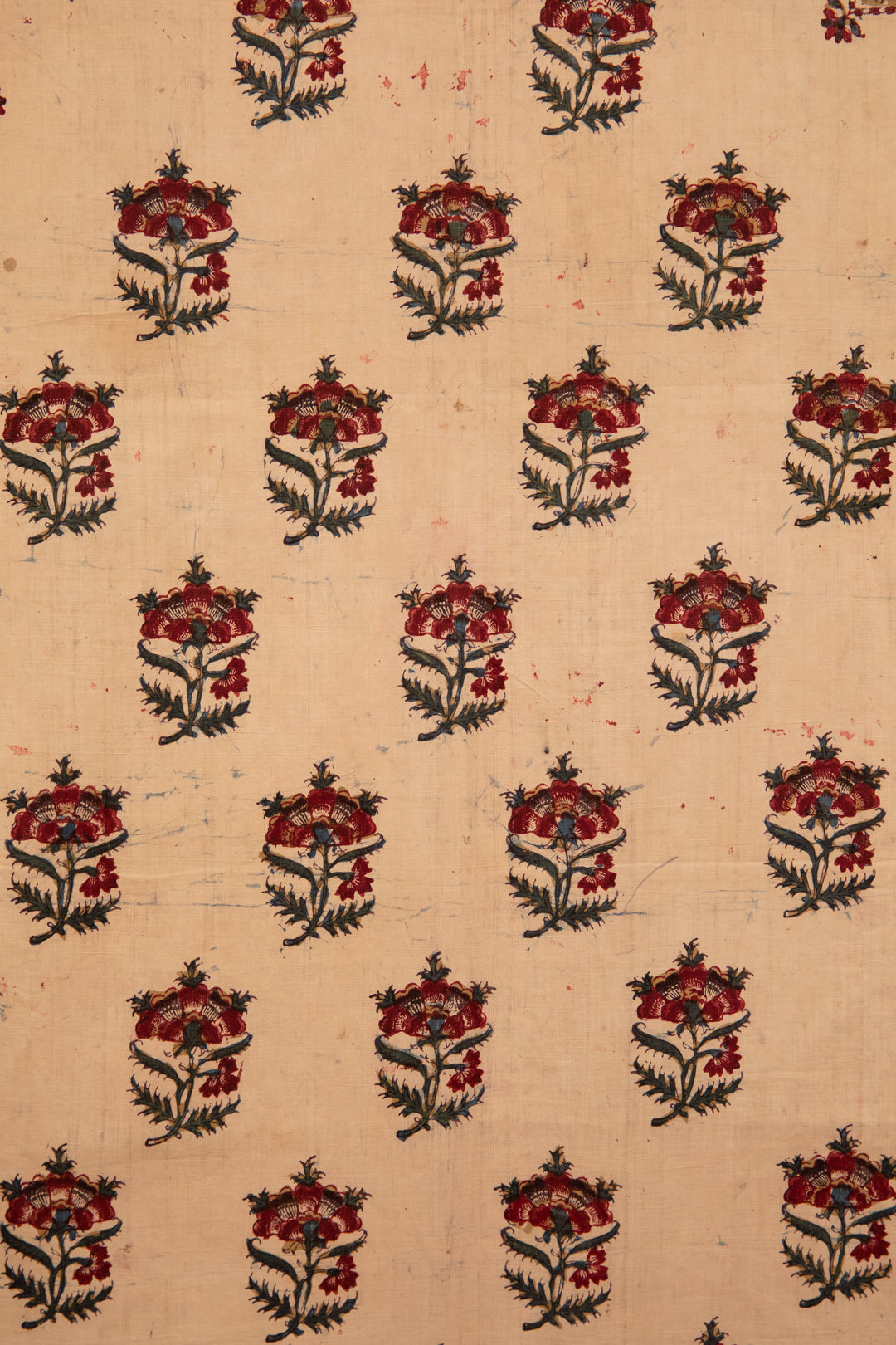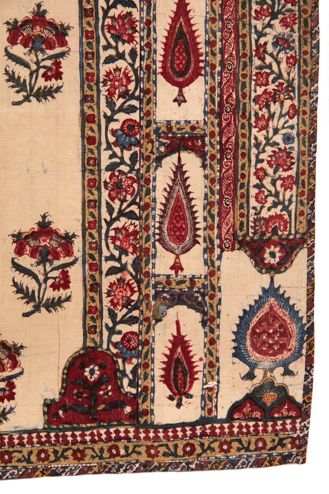 Kalamkari is a method of block printing. The registry, where the borders of the blocks meet, is most important as is the quality of the carving of the blocks and the numbers of colors used. Only natural dyes are used in kalamkari and it involves 23 steps. Many Iranian kalamkaris, as a matter of fact, the best of them, were actually produced in India, along the Coromandel Coast, and in Gujarat. Prayer arches were particularly popular and most common motifs were flowers, cypress trees, citadels, peacocks and lions, usually in a symmetrical composition. Better kalamkari may also have some painted details.