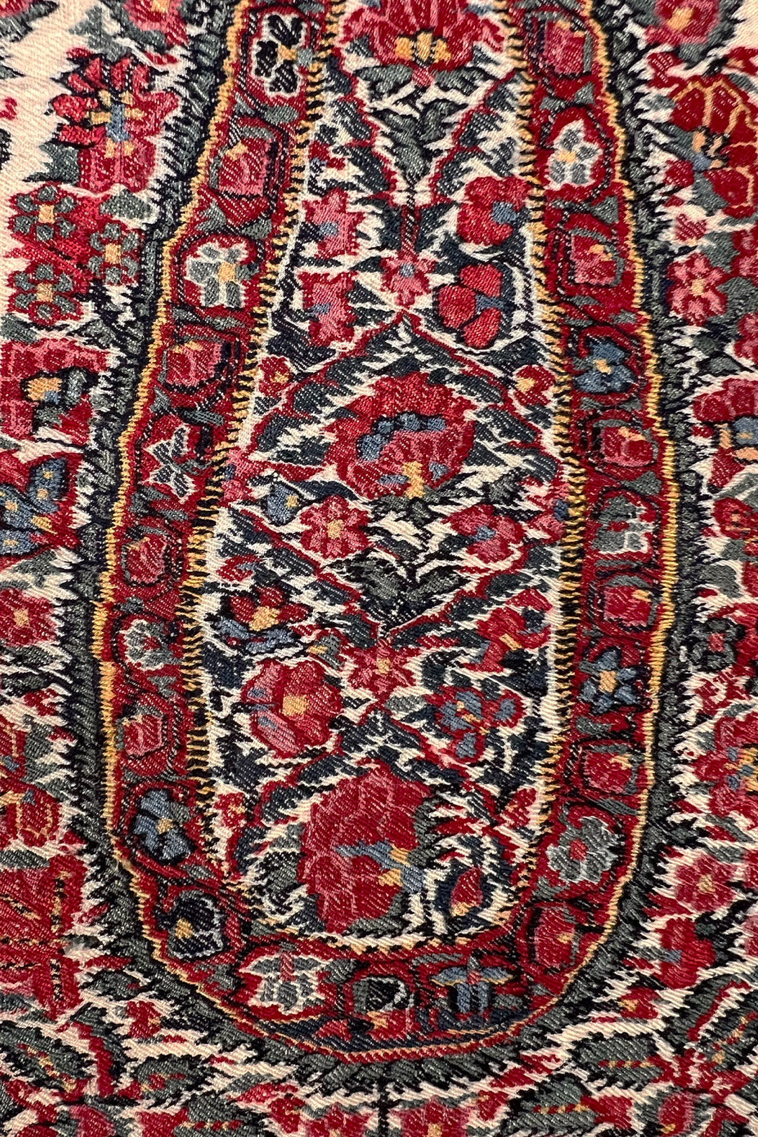 Kashmir shawls combine excellent materials, precise technique, and artistic creativity. The wool used comes from the fine under-hair of the Asian goat. It is spun into a superior and thin yarn of the highest grade. The weaving technique is double interlocking twill tapestry, which is labor-intensive and requires small armies to carry out. As their style evolved through the years, they can be reasonably accurately dated.
