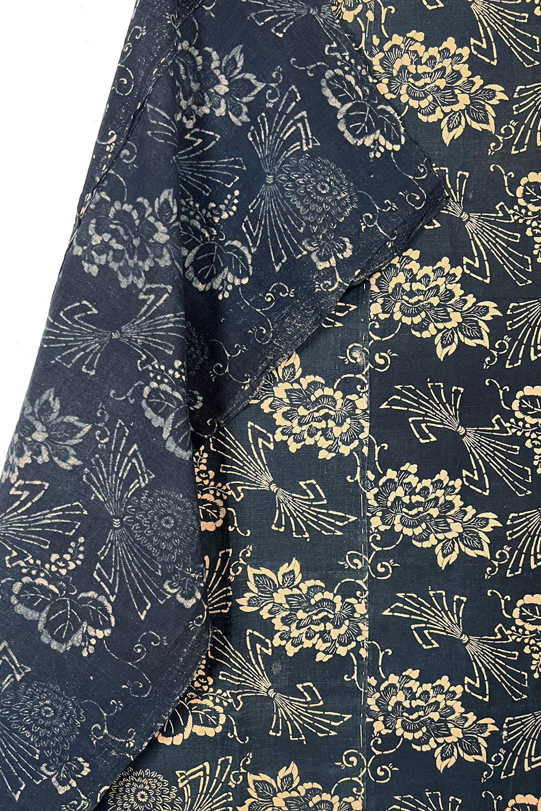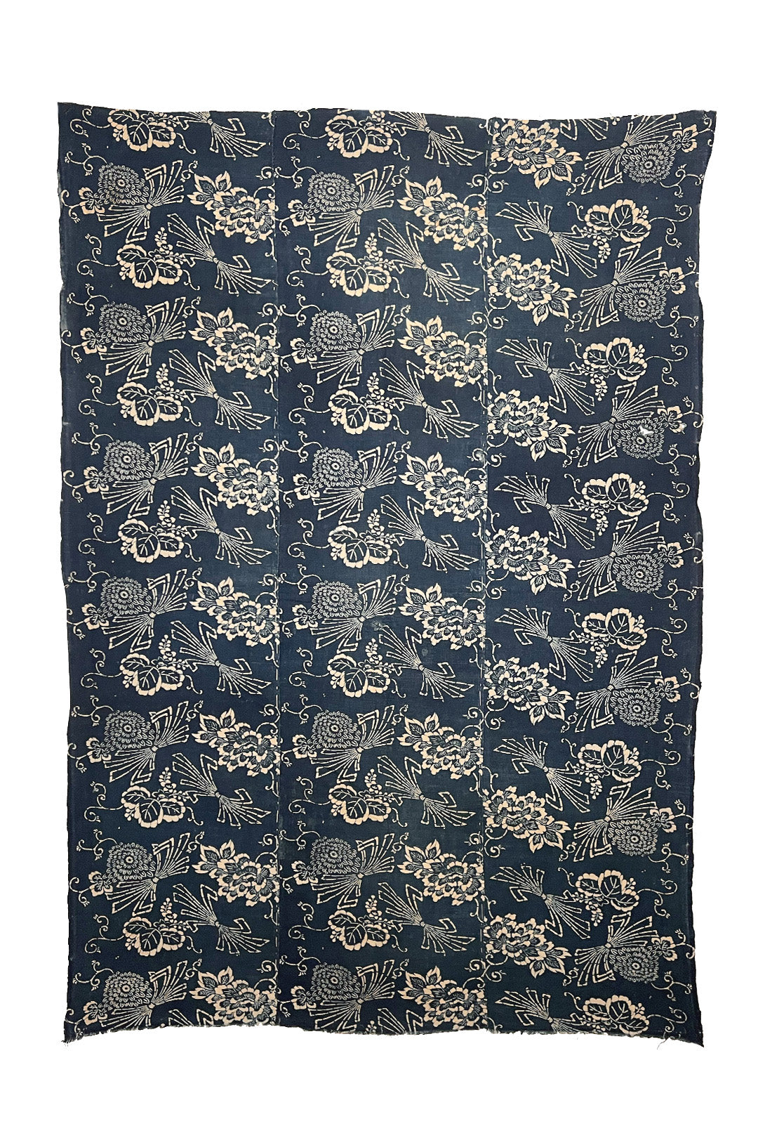 Katazome is a batik-like method of painting using a paste, then dying the piece, revealing the design once the paste is washed away. This piece is comprised of three floral panels sewn together.