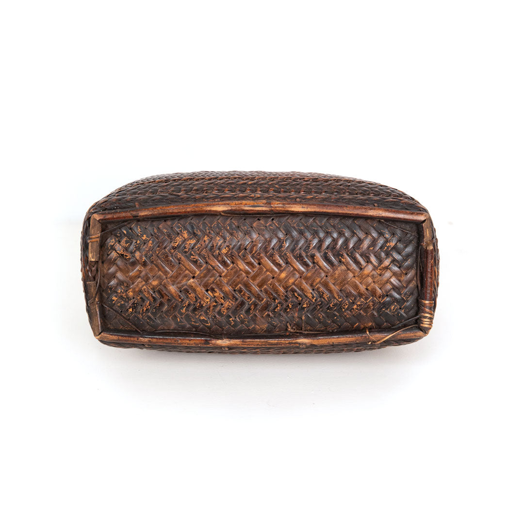 This rare woven basket was intended to store tobacco and/or opium products. The bottom would store the substances, the middle was for paraphernalia, and the top would close the two baskets below. The piece is shaped to also be used as a pillow. There would have been a thin bamboo strap used to carry it, but that is usually the first element to wear away.