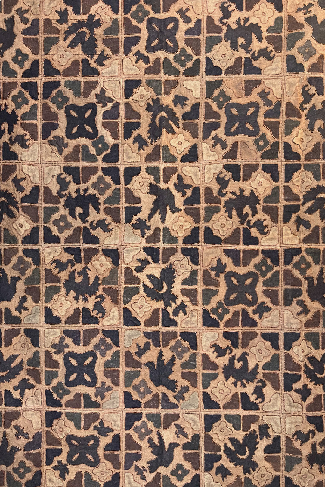 This piece is decorated with embroidered or appliqué geometric, organic, and animal shapes. The appliqué fabrics are shades of indigo, which is common in this region, and neutral tones. The ground is a natural colored cotton and is pieced together in squares, with the appliqué creating smaller shapes within that.