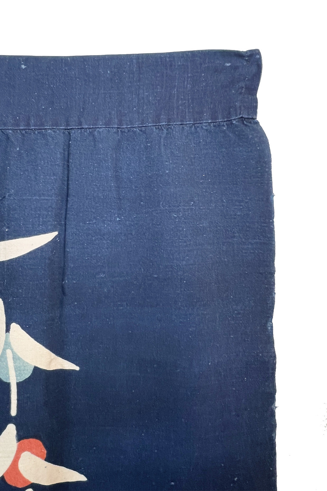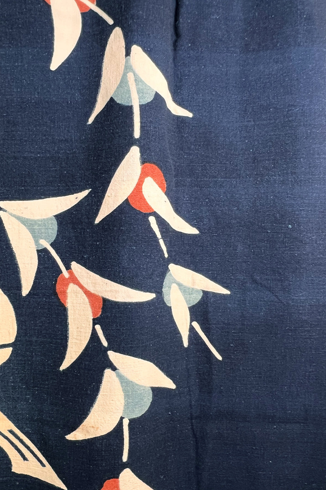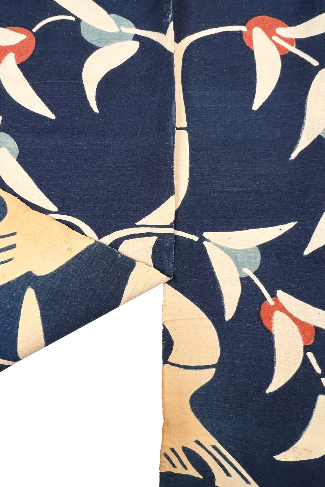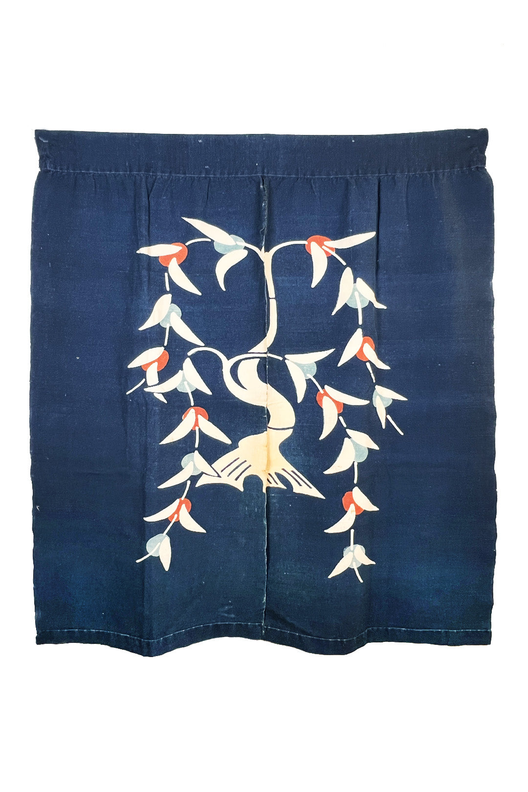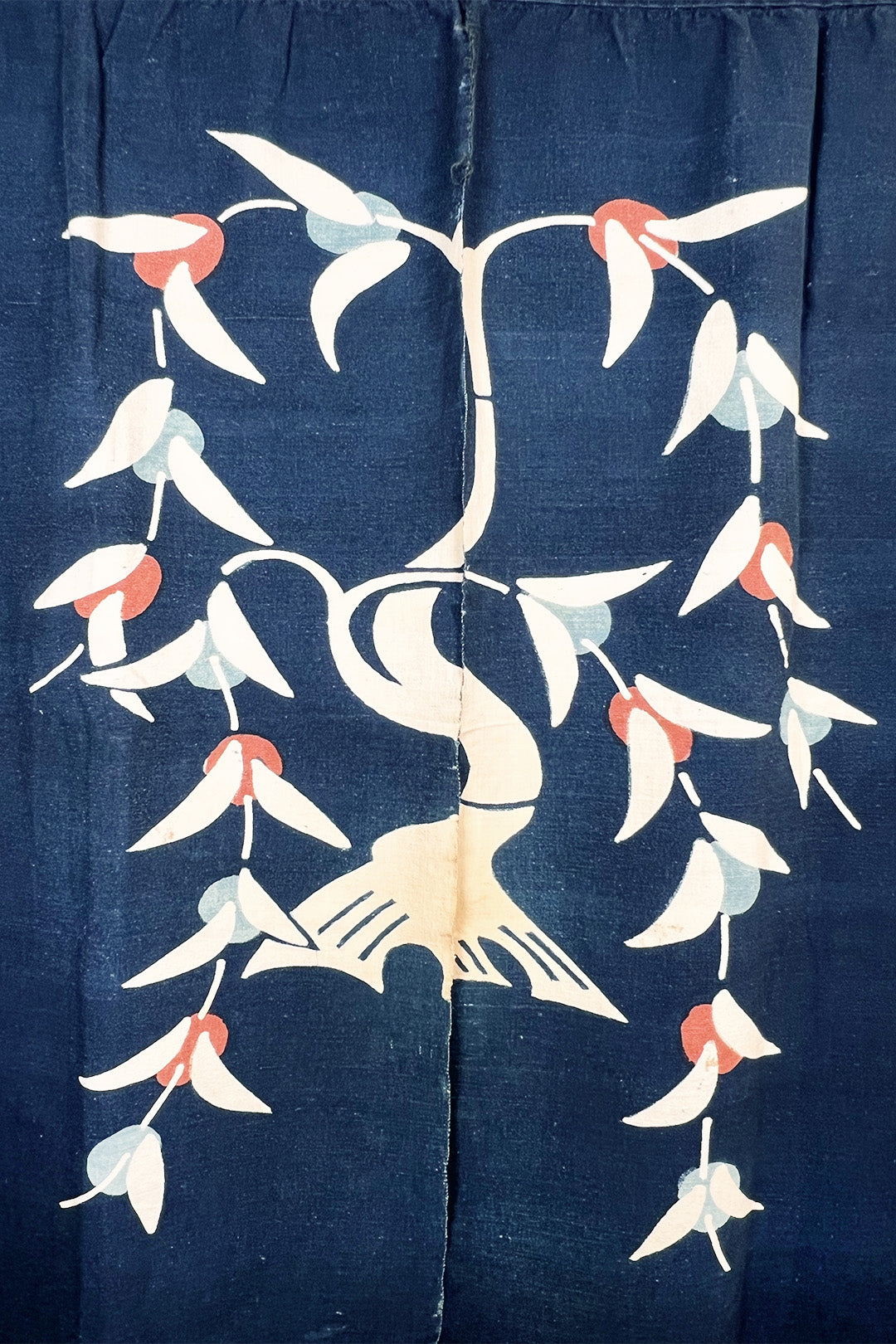 Yuzen is a batik-like method of painting using a paste, then dying the piece, revealing the design once the paste is washed away. The paste was used to create a tree on this noren, which is a curtain traditionally used to separate rooms in a doorway. This piece is double-sided. It can be used for it's original purpose, or as a wall hanging.