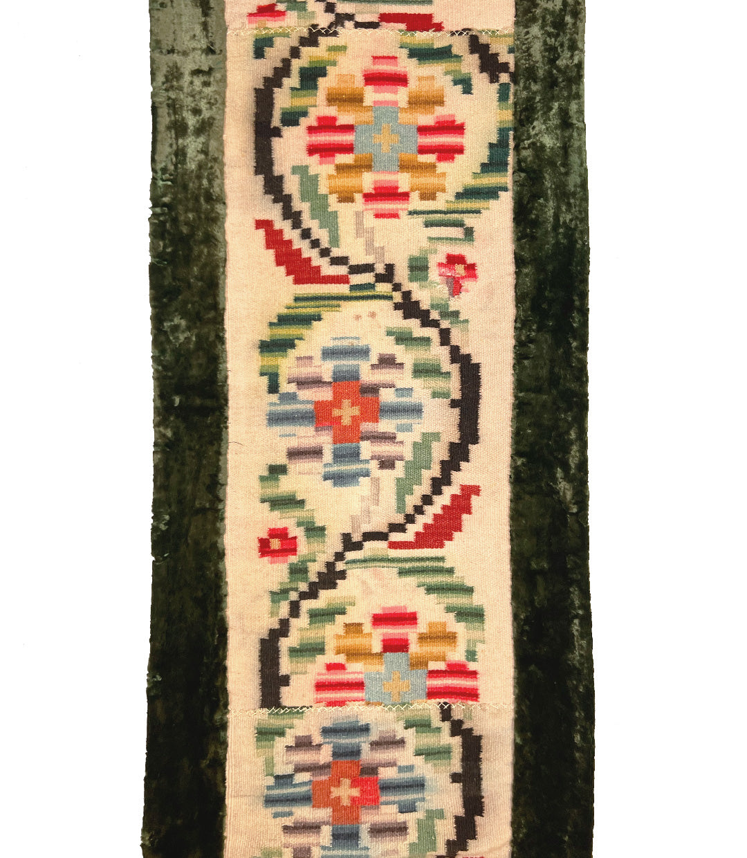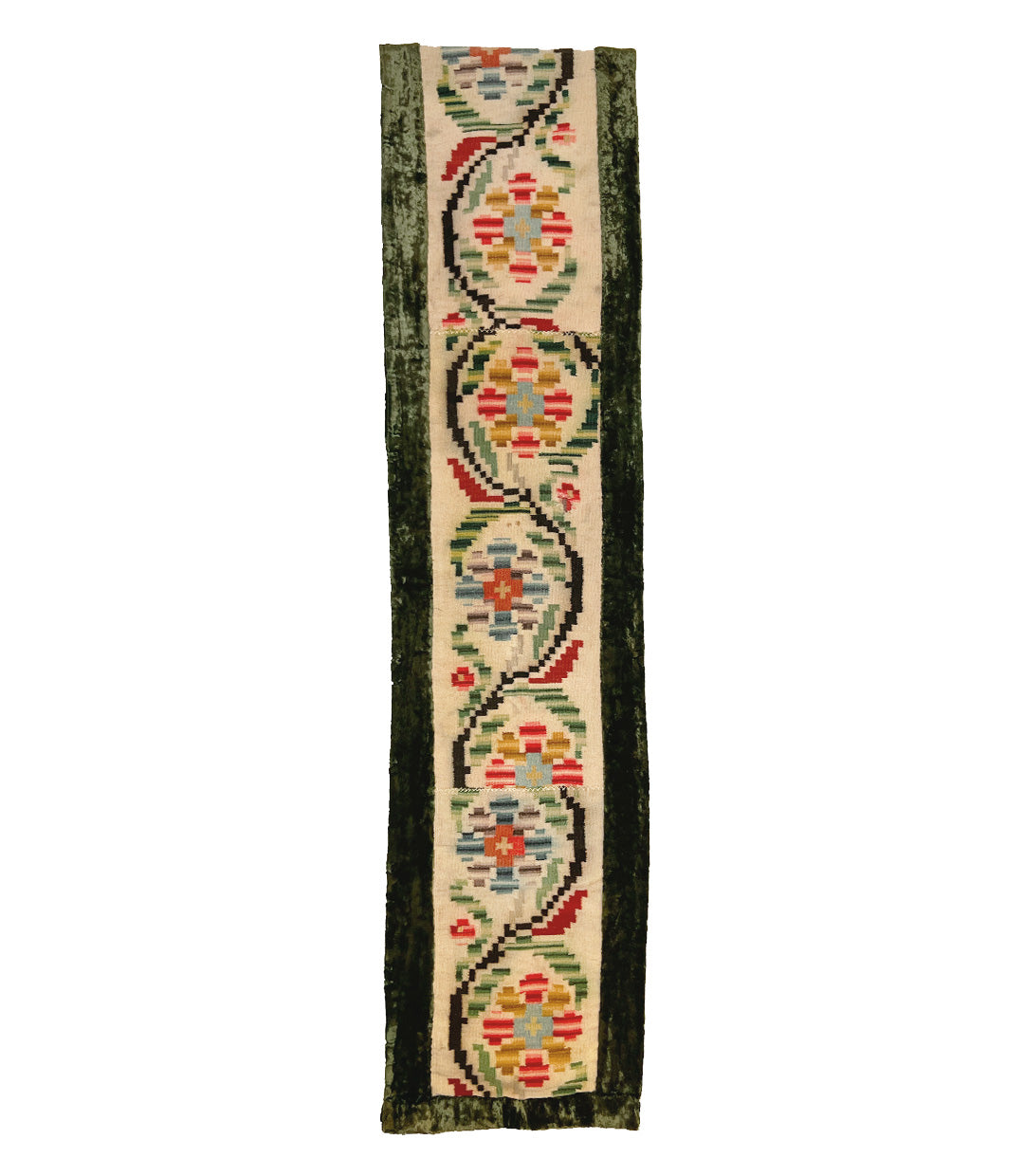 This runner or wall hanging is made up of fragments from an antique Mexican Serape, or blanket. It is bordered and backed well using green crushed velvet. The sharp gradient of colors and geometric form was created by a precise and skilled weaver.