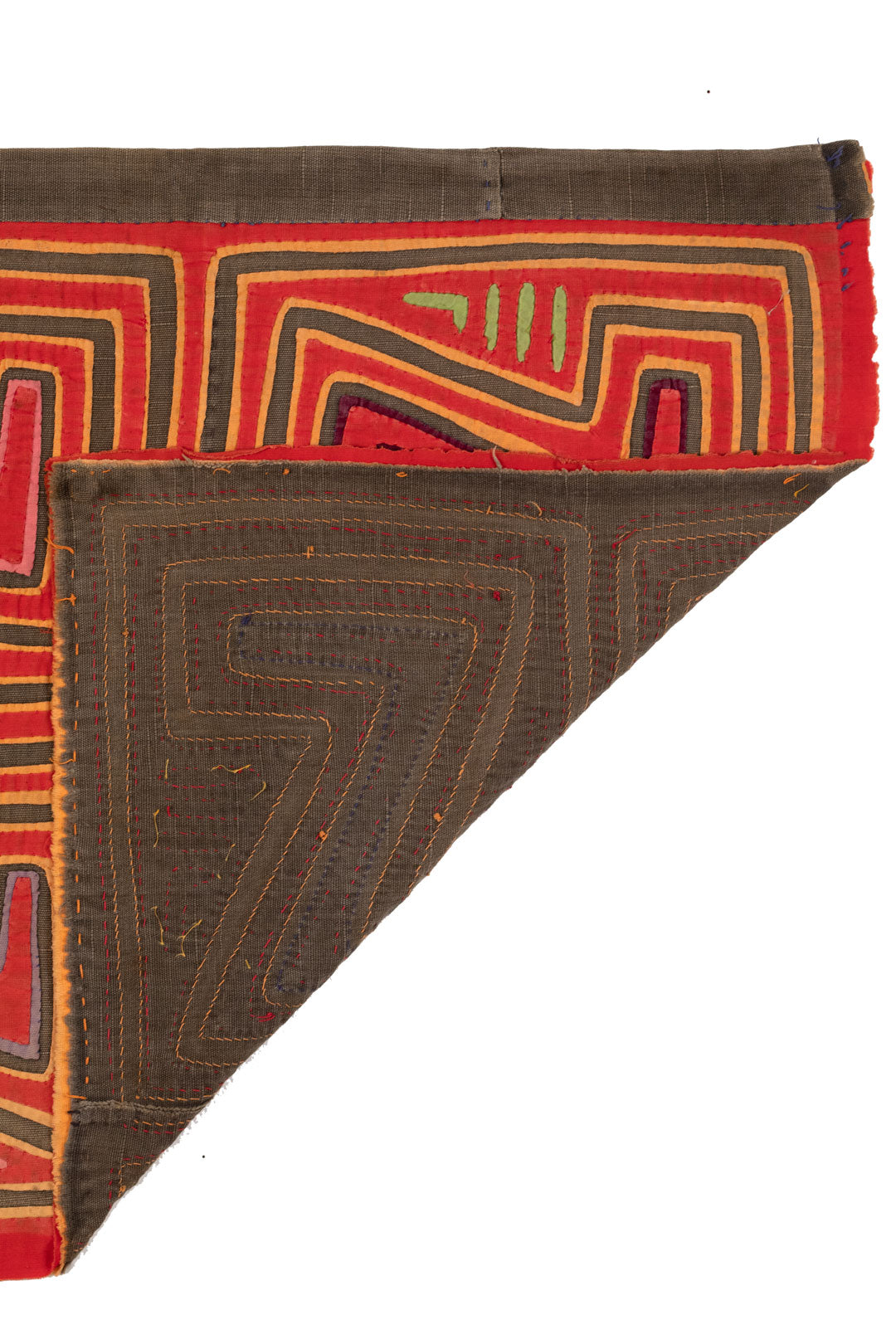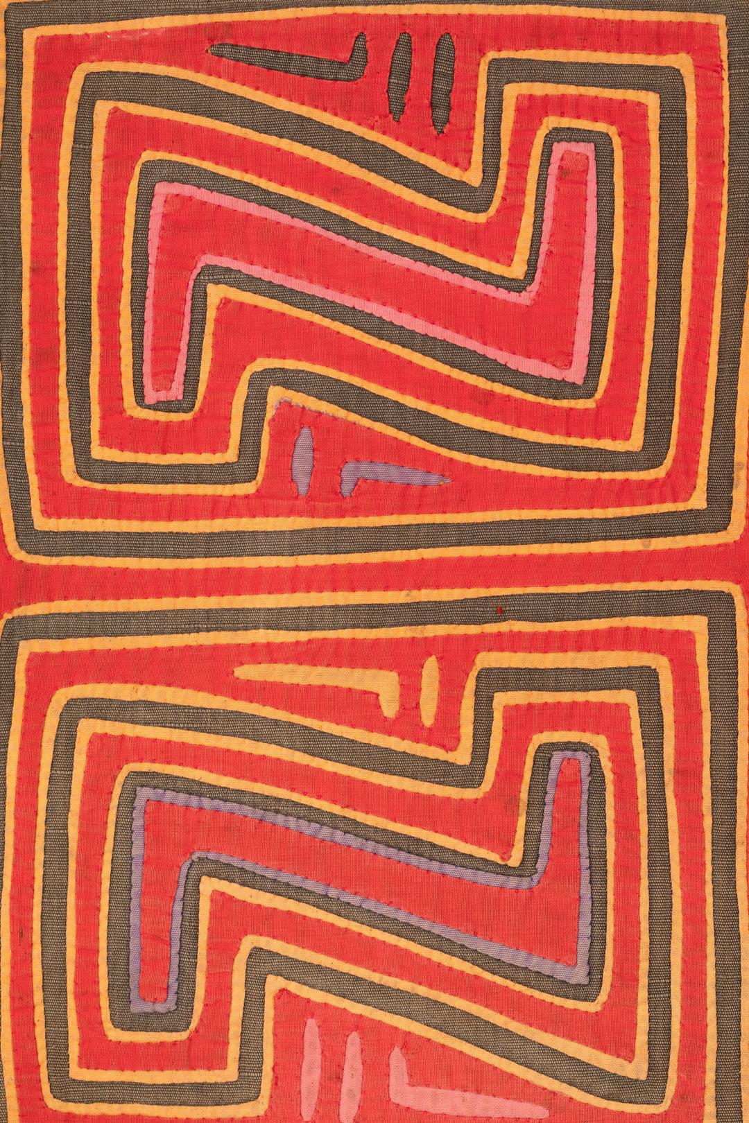 A mola cloth decorated with zoomorphic "Z" shapes. The Cuna people of Panama developed a unique type of applique, the mola cloth, done mostly in small rectangles that were used as front pieces for their blouses. Originally molas were made in few colors, one fabric superimposed on the other with the upper one cut and sewn down. Later versions get more intricate, using more layers and complex designs.